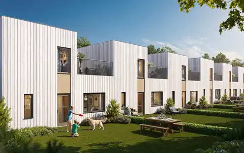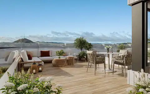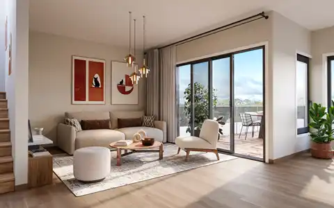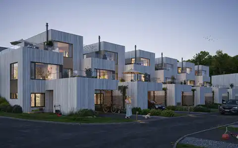 I første etasje åpner hjemmet seg opp med en lys og luftig stue/kjøkken- løsning, et ekstra soverom, bad og direkte utgang til uteområdet på baksiden. Over carporten venter en stor takterrasse – ideell for solrike dager og lange sommerkvelder.