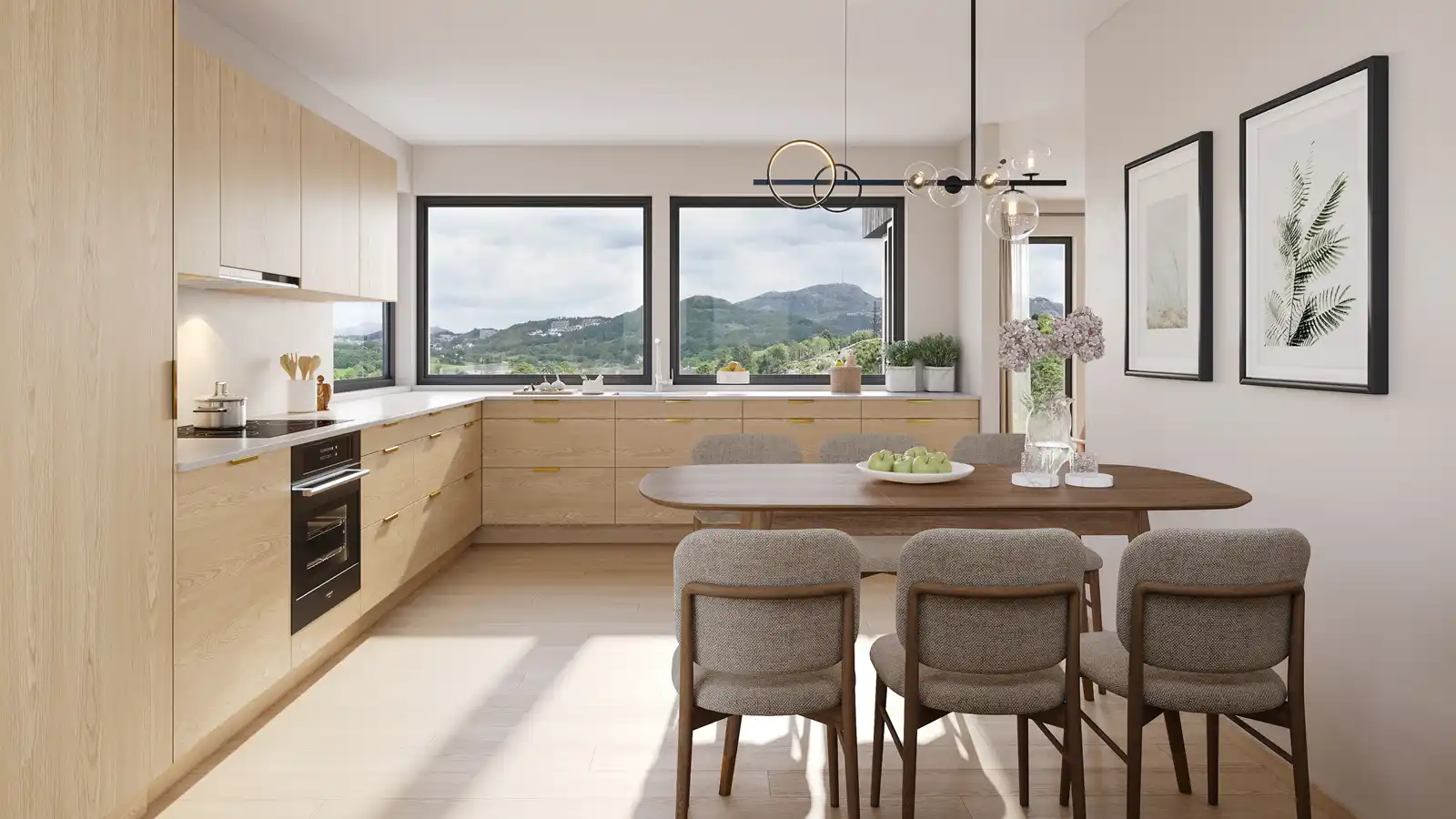 Denne etasjen rommer en romslig stue med åpen kjøkkenløsning, omgitt av store vinduer på flere sider som slipper inn rikelig med naturlig lys. Alle boligene har peis, som skaper en koselig atmosfære. Fra stuen har du også utgang til terrasse og hage. Her ute kan du nyte kveldene i godt selskap, kanskje med noe godt i glasset, eller oppleve magiske øyeblikk alene. Vi trenger begge deler.